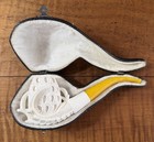VTG Block Meerschaum Pipe Hand Carved Turkey Floral Lattice Bent Stem W/ Case