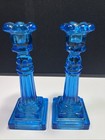 Antique Pair of Blue Clambroth Sandwich Glass Petal Candlesticks 8.3" Rare Hexag